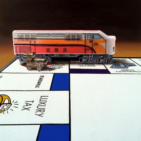The Monopoly ongoing series began as a one-off series of three paintings for an invitational group show with Elliott Fouts Gallery in the Spring of 2012. The title of the show was, 'Planes, Trains, and Automobiles' and, in looking for unique subject matter among her large collection of game boards and vintage items, Jelaine found a combination of things could add up to a few clever stories. She has loved the game of Monopoly since childhood, and painting all her favorite pieces was a nostalgic joy. So much so that she decided to leave the series open-ended, and continues to add to it in the eleven years since. Please click on the individual images below for title/size/medium.